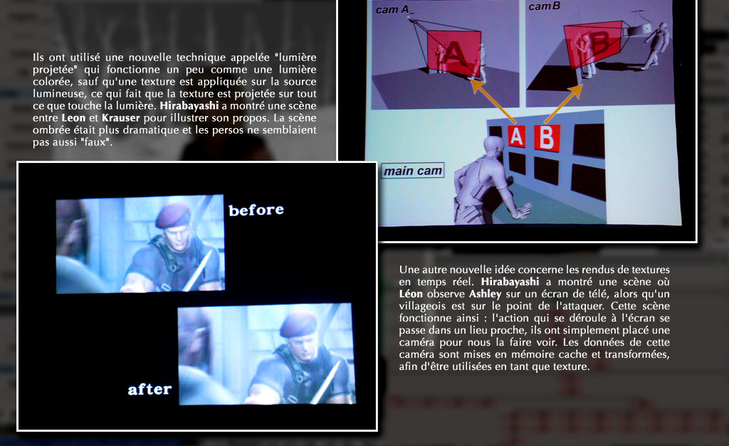 Ils ont utilisé une nouvelle technique appelée "lumière projetée" qui fonctionne un peu comme une lumière colorée, sauf qu'une texture est appliquée sur la source lumineuse, de sorte à projeter la texture sur tout ce que touche la lumière. Hirabayashi a montré une scène entre Leon et Krauser pour illustrer son propos. La scène avec les ombres était plus dramatique et les personnages ne semblaient plus aussi "faux".