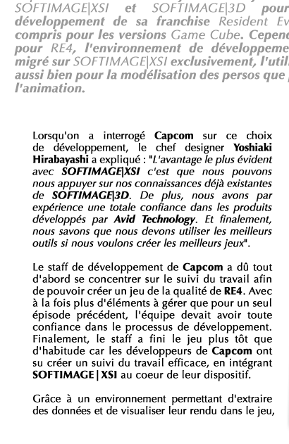 Grâce à un environnement permettant d'extraire des données et de visualiser leur rendu dans le jeu, SOFTIMAGE|XSI a permis de faire de Resident Evil 4 une réalité. Capcom s'est également beaucoup appuyé sur l'Animation Mixer qui permet de gérer d'énormes flux de données, tels que les mouvements de caméra, qui sont nécessaires à la création d'un jeu.